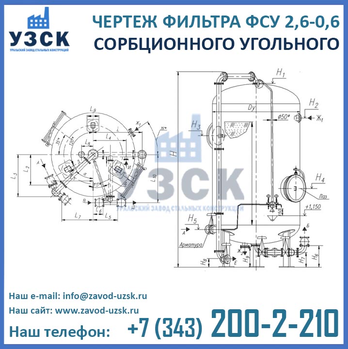 Изготовление сорбционных угольных фильтров ФСУ 2,6-0,6 в Балхаше осуществляется из стали. Корпус аппарата представляет собой цилиндрическую обечайку из стального листа с приваренными к ней сверху и снизу штампованными днищами эллиптической формы. Для монтажа на фундамент, фильтр оснащен тремя опорами. Для присоединения трубопроводов обвязки в центре днищ имеются фланцы. Корпус аппарата снабжен двумя люками-лазами, необходимыми для загрузки сорбента, осмотра, ремонта и обслуживания фильтра. Внутри фильтра расположены нижнее сборно-распределительное устройство (НРУ) и верхнее (ВРУ).
