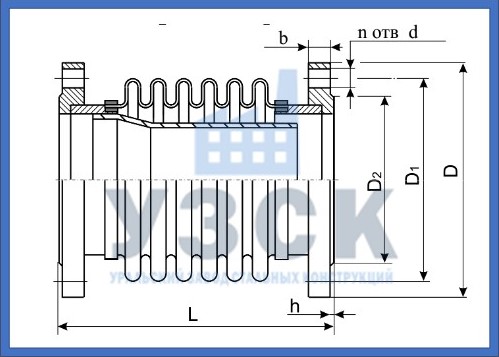 Устройство предназначено компенсировать температурные удлинения участка трубы, закрепленном на неподвижных опорах. Чтобы сильфон справился с усилием сжатия и компенсировал удлинение, температура подаваемого агента должна быть ниже 200 0 С. При этом диаметр трубы может быть 65 – 1000 мм.